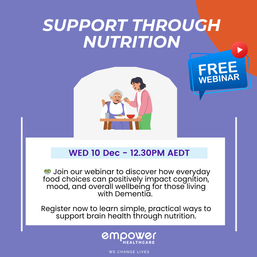 Living Well with Dementia Webinar – Support Through Nutrition Living Well with Dementia Webinar – Support Through Nutrition by 61 61 people viewed this event. SoMe Nutrition Dec 2025 Register for event To register for this event please visit the following URL: https://us06web.zoom.us/webinar/register/WN_GGNrJMMqSACSKW5St14JVQ → Date And Time 2025-12-10 @ 12:30 PM to 2025-12-10 @ 01:00 PM Registration End Date 2025-12-10 Location Online event Event Types Seminar or Talk Share With Friends Facebook Twitter Linkedin Xing Pinterest Living Well with Dementia Webinar – Creating Enabling Envrionments Living Well with Dementia Webinar – Supporting Physical Health and Wellbeing